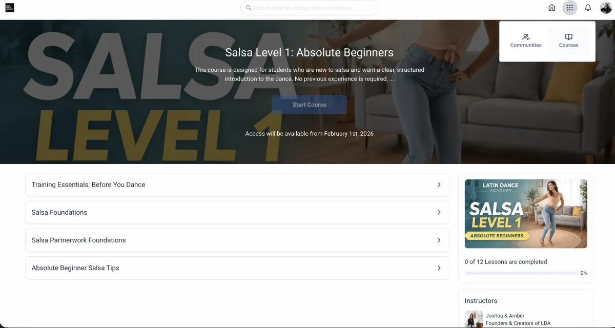 Your monthly membership gives you ongoing access to LDA’s on-demand Latin dance training, including Salsa, Bachata, Cumbia foundations, technique breakdowns, musicality training, and structured practice guidance.
